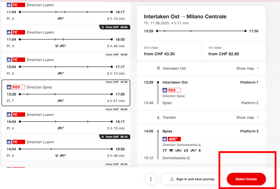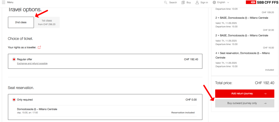 다시 인터라켄 갈 게 아니라서 Buy outward Journey only로 클릭!