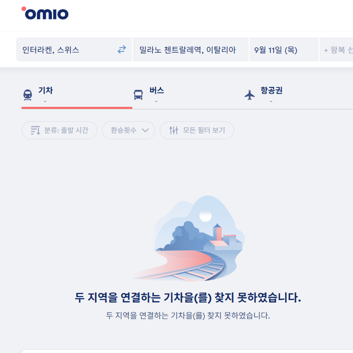 가격비교하려고 OMIO에서 검색했더니 인터라켄-밀라노 다이렉트로 조회는 안되네요